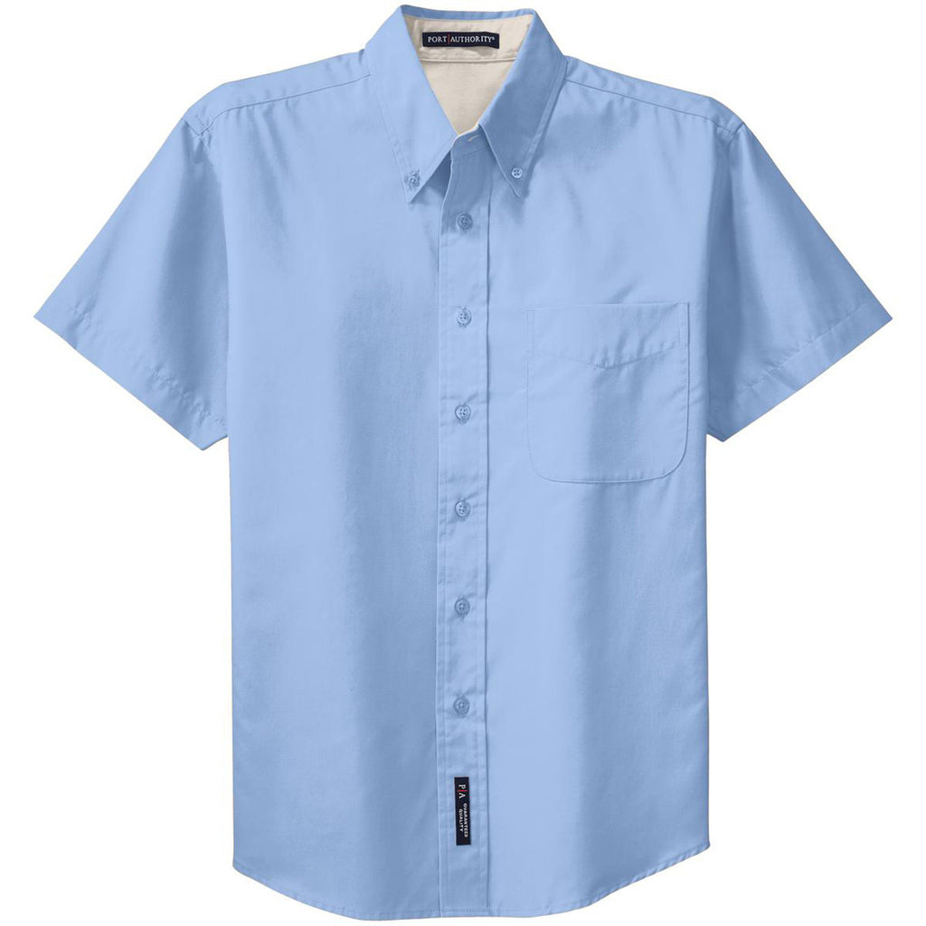 A short-sleeve button-down made for the workday but professional enough for upscale events? No, you're not dreaming: that's actually an apt description for Port Authority Men's Light Blue/Light Stone Short Sleeve Easy Care Shirt. The 4.5-ounce, 55/45 cotton/poly blend fabric is perfect for breathing, while the button-down collar ensures that your employees will always be event-appropriate. The patch pocket scores points for function as well as dressiness, and the dyed-to-match buttons are as subtle as they are necessary. And if you ask us, a good work shirt should be understated, allowing your own corporate embroidery and custom business logo to earn the attention.Corresponding Women's Style: Port Authority Women's Light Blue/Light Stone Short Sleeve Easy Care Shirt