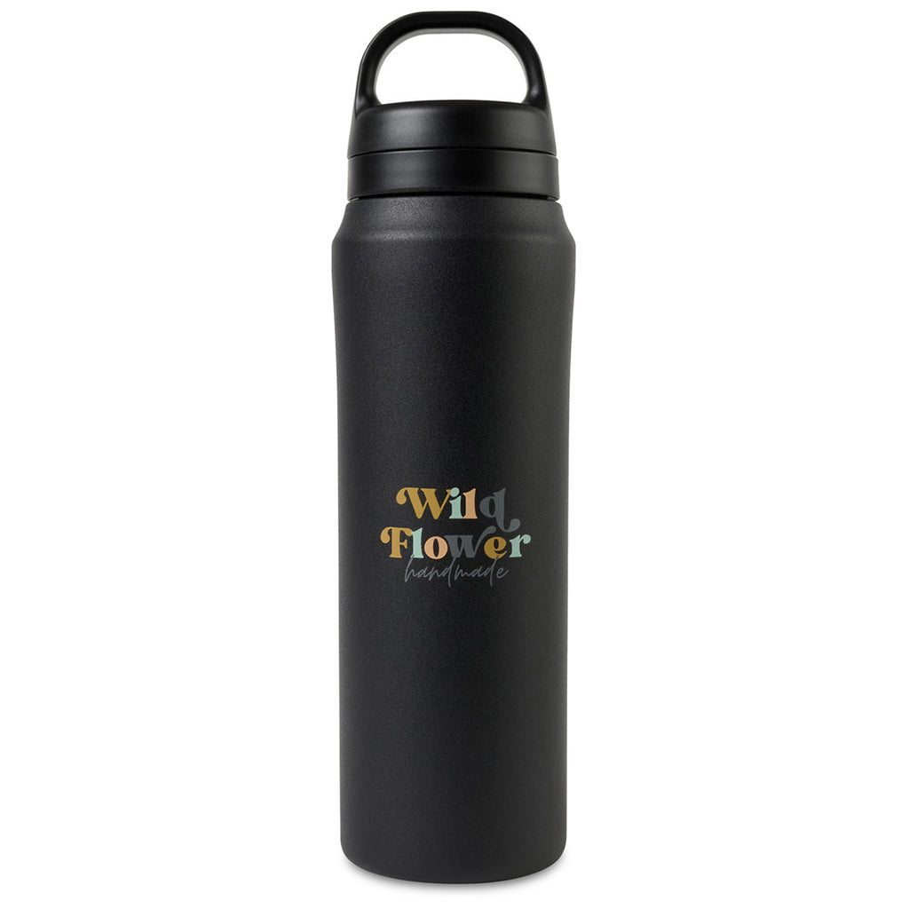Aviana Black Rowan Recycled Water Bottle - 16 Oz. with a custom logo creates a cute product option to share with friends, family, and customers. The smaller bottle is great for short hikes, school, or the office to help you stay hydrated throughout the day. The convenient top handle allows this to be clipped to a backpack or tote as needed.