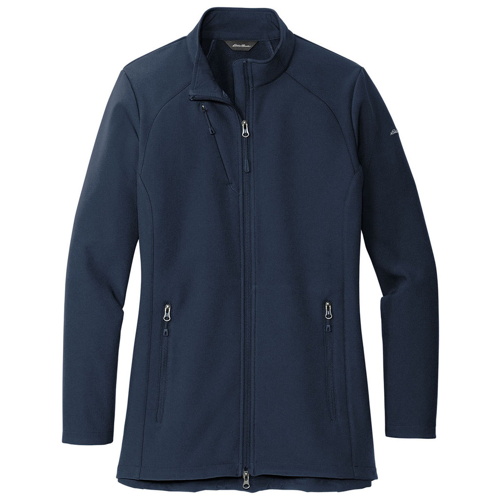 The Eddie Bauer Women's River Blue Navy Stretch Soft Shell Jacket is a great all-weather jacket. Keep warm with soft fleece lining on a chilling day. The polyester/spandex material blend provides ease of movement for the active day. Create a custom jacket by adding a logo on the chest and broadly display any brand.