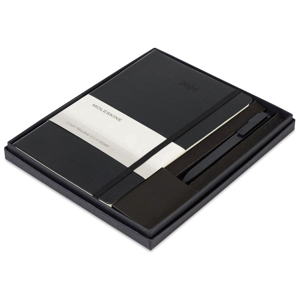 • This gift set includes one Soft Cover Large 12-Month Weekly 2026 Planner and one GO Pen packaged in a two-piece Moleskine gift box
