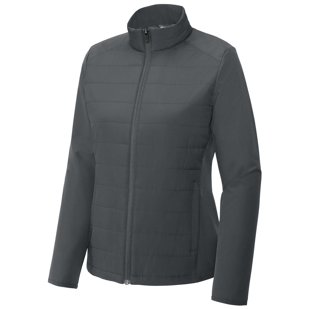 Corporate apparel meets performance with the Sport-Tek Women's Iron Grey Teknical Hybrid Jacket. Lightweight insulation and stretch fabric create warmth and flexibility, while a clean design keeps it professional. Add your custom logo for a branded jacket that transitions seamlessly from office to outdoors. Ideal for employees, clients, or active team members.