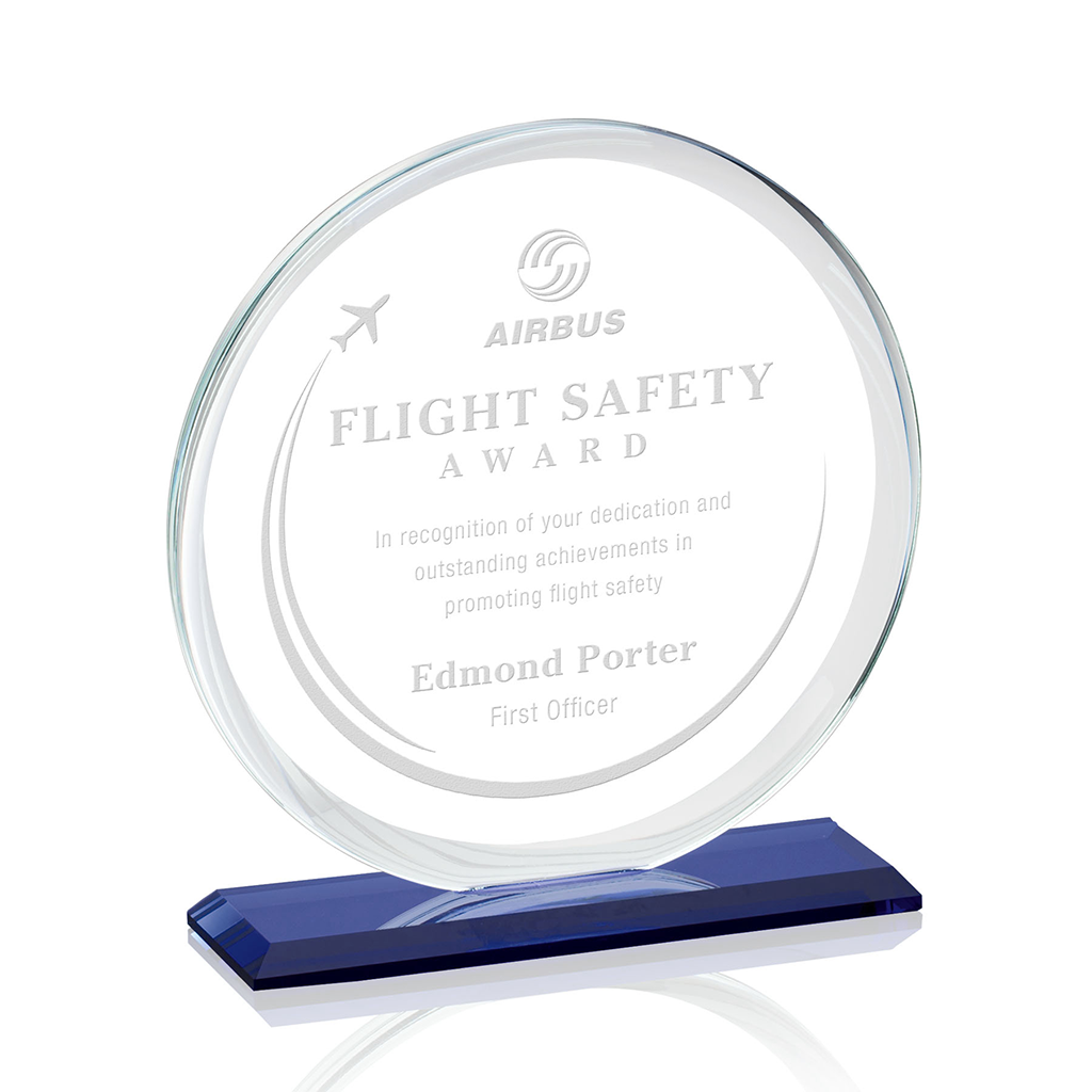 St. Regis Sapphire Verdun Award - 7.25" x 7.25" - Laser Engraved with a custom message comes in multiple sizes to fit your special awards ceremony needs. The Verdun Crystal award is a perfect beveled circle mounted on a deep sapphire mitered base. The beveled frame illuminates your special achievement with radiant light.The minimum order for this product is 1 piece.