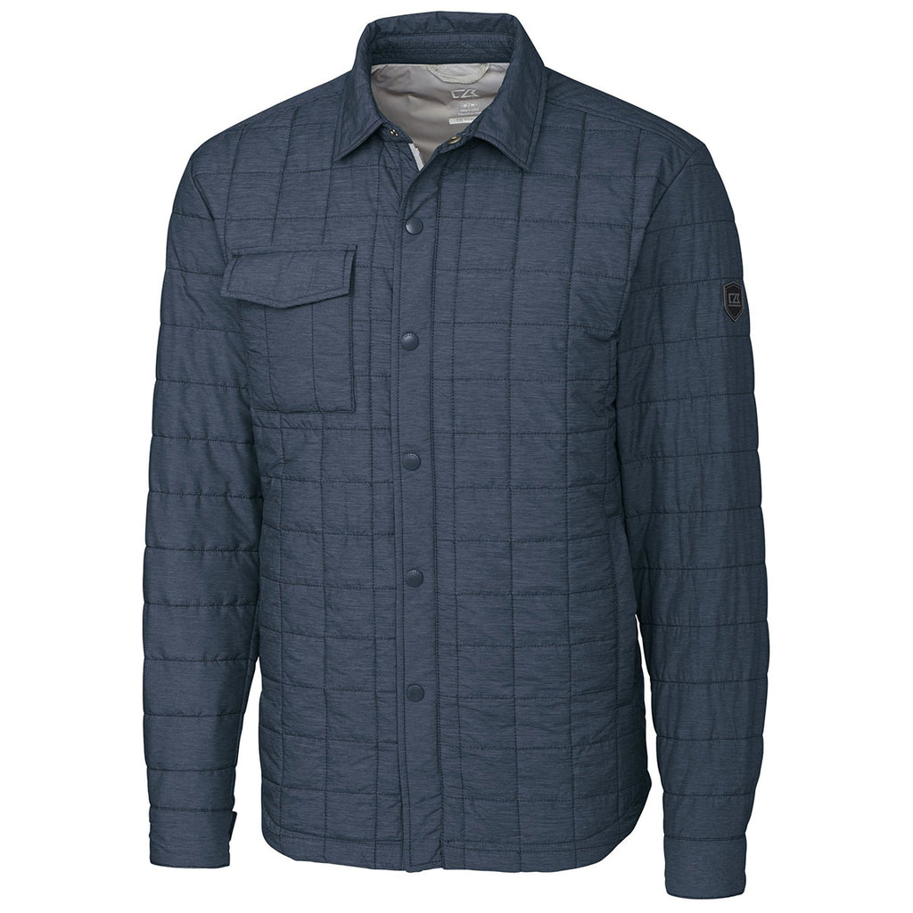 The Cutter & Buck Men's Anthracite Melange Tall Rainier Shirt Jacket offers ideal warmth in an attractive men's jacket. Add your company logo to the jacket, which comes in classic colors. This outerwear item is an ideal product to purchase and hand out to company employees and attendees at upcoming corporate events, such as recruiting events and golf events. Features of this men's jacket include 100% nylon material, CB Weathertec fabric, wind and water-resistant qualities, full zip and snap closure combination, right chest pocket with snap, and fully lined interior.Highlights