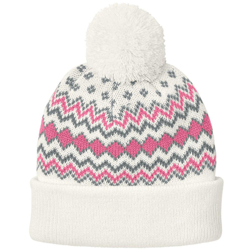 Port Authority Marshmallow/Awareness Pink/Gusty Grey Alpine Pom Beanie