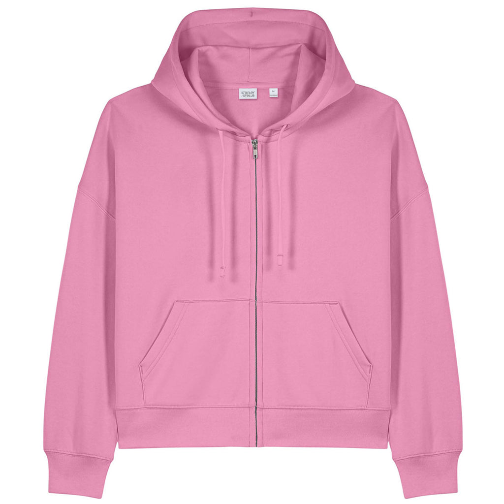 Stanley/Stella Women's Bubble Pink Stella Ida Full-Zip Hooded Sweatshirt with a custom design offers cozy warmth with its organic cotton fabric and modern design. The adjustable hood provides additional coverage, while the full-zip style makes it easy to layer. Whether out on a brisk day or relaxing at home, this sweatshirt blends comfort and sustainability in one essential piece.This product cannot ship outside of the United States.