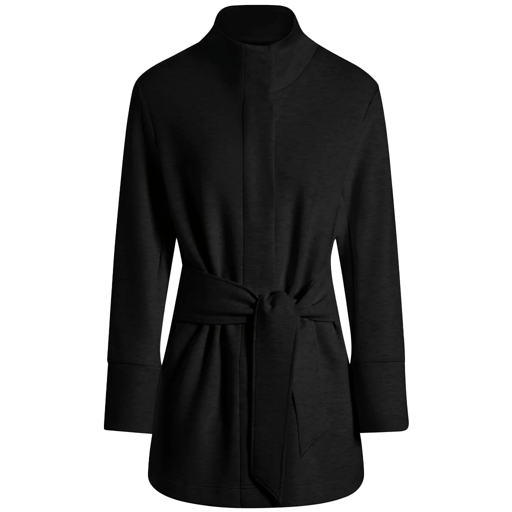 - Contemporary fitted jacket with a high neck, panelled sleeves, side seam pockets, and snap fastenings at the front